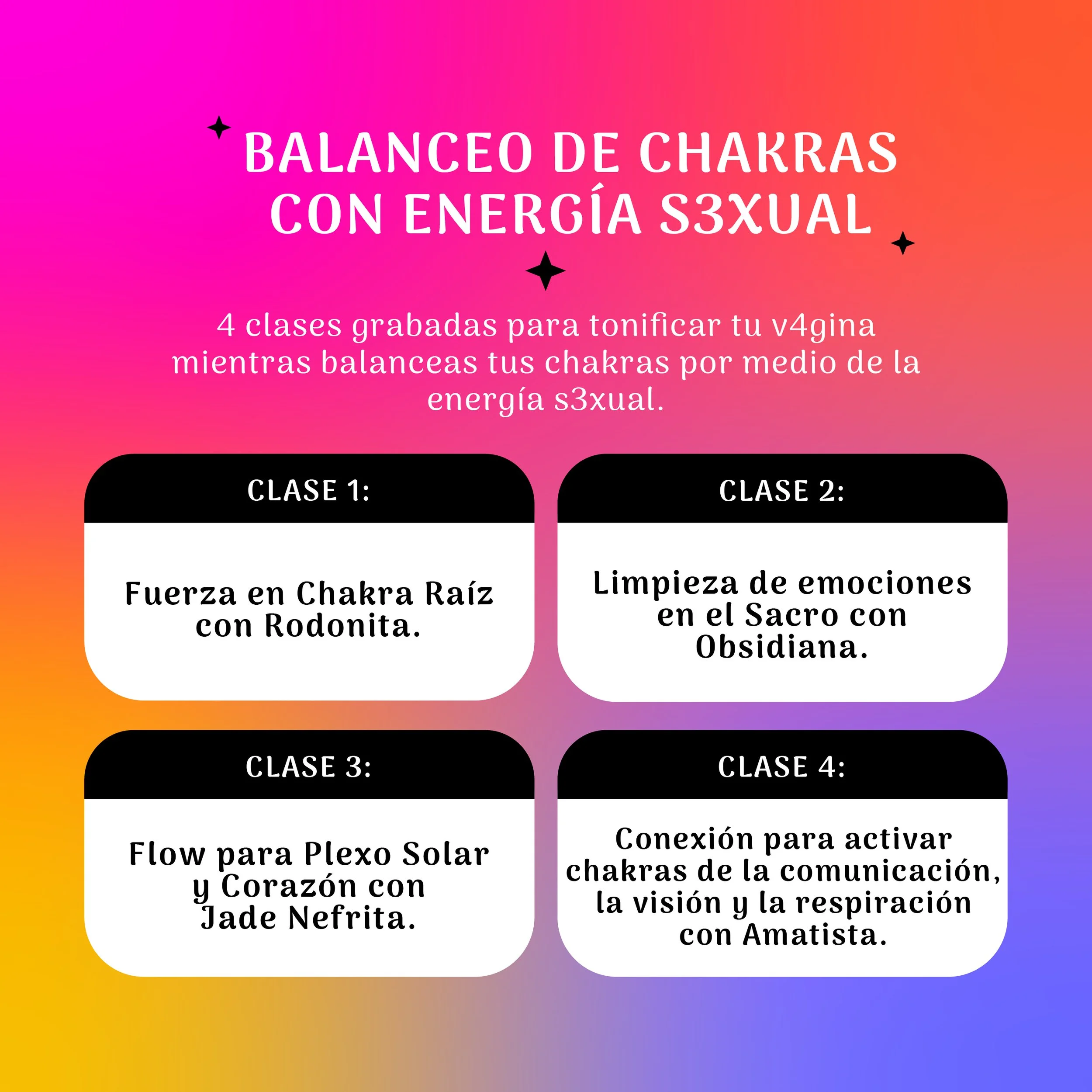 Cada clase viene con aprendizaje sobre cada CHAKRA que trabajamos por clase, además de una práctica deliciosa de movimiento sensual y consciente que te llevará a despertar tu ENERGÍA SEXUAL y a nutrir tus chakras con esta descarga pura de vitalidad.
